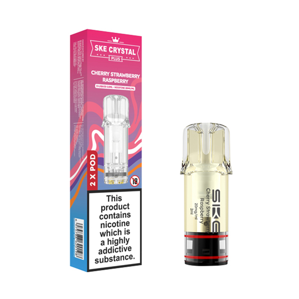 The SKE Crystal Plus Cherry Strawberry Raspberry prefilled pods are designed to work perfectly with the SKE Crystal Plus prefilled pod kit. Each pod comes ready-filled with e-liquid, so you don’t need to refill or maintain anything, and dispose of it when it’s empty.